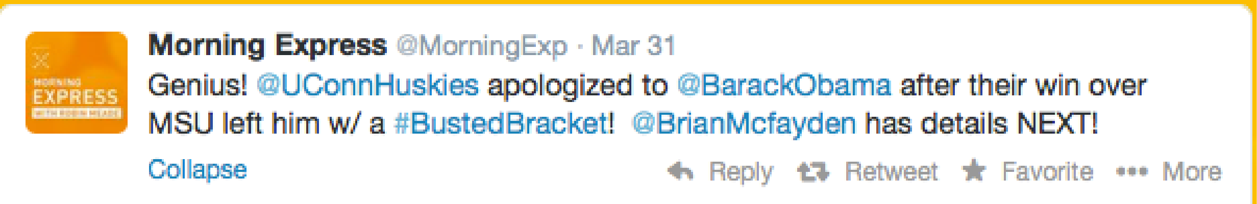 10 years ago on March 30, 2014, The UConn Huskies upset Michigan State in the Elite 8 of the Mens NCAA March Madness tournament, this win effectively busted then President Barack Obama's bracket who had Michigan State to win the whole thing. At the time, GO Agency was managing marketing for UConn athletics and their Twitter account and we put out this tweet: